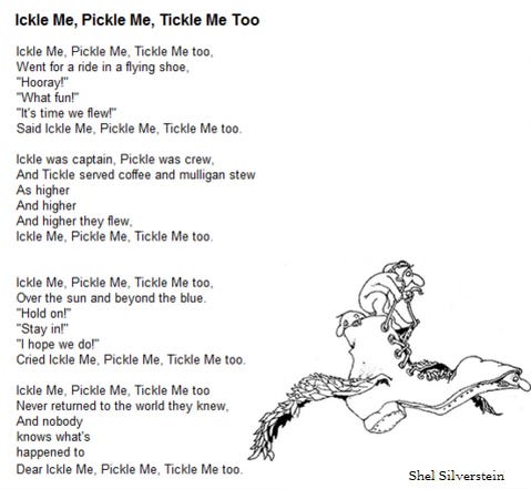 The Wayside School books took place in a 30-story building accidentally constructed from a sideways blueprint and were full of silly math jokes and wordplay. Bruce Coville wrote a series of insane alien books that were likely my first sci-fi and so much fun.I’ve also always loved approachable poetry that isn’t self-serious and I had lots of early exposure. Collections by Paul Fleishman, Jack Prelutsky, Judith Viorst (Is If I Were In Charge of the World: And Other Worries too on the nose for me as a favorite?), and Shel Silverstein were in heavy rotation and always made me laugh. There’s a chance my husband said something this week (possibly just mentioning a group of three things) that triggered me to dig the poem below out of the depths of my memory and start reciting it on the spot.